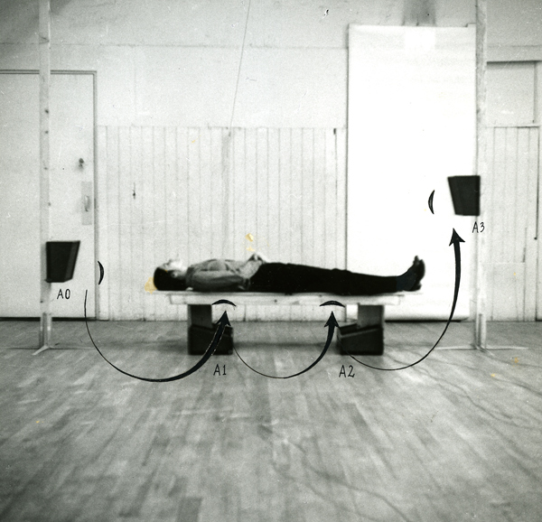 Notation einer wellenförmigen Ton-Bewegung zwischen 4 Lautsprechern