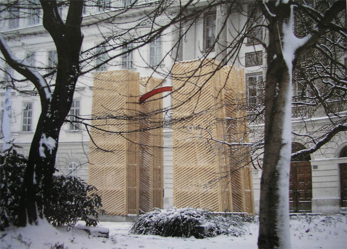Die Pylonen sind das Gerüst für eine akustisch sinnliche Erfahrung, für ein nicht sichtbares, immaterielles Zeit-Gewölbe, welches die statische visuell starre Form der Pylonen kontrapunktiert. Sechs Laut-sprecher sind in jedem der beiden Pylonenpaare montiert. Die Abmessungen eines Turmes betragen 260cm x 90cm x 740cm. Zwischen den Holzstrukturen ist kreisförmig eine rote Bogen-linie aus schmalen Leimbindern eingezogen.