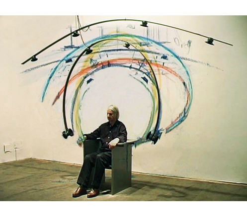Doppelschalig wölben: Zwei gekrümmte Flacheisen hängen über-einander frei im Raum. An ihnen sind 10 Lautsprecher befestigt.Sie tragen dieimmateriellen Gewölbe aus Ton-Linien, die sich eng (4-kanalig) und weit (6-kanalig) – wie verschiedene Firmamentschalen – wölben. Das Bau-Material sind Klänge.