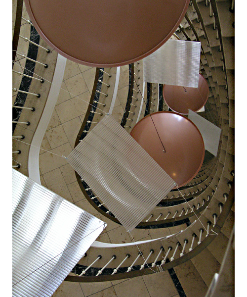 an die Innenwände des Treppenhauses weiterspiegeln. Man hört nicht die Quelle des Klanges, sondern in zum Teil grossen Abständen davon die frei schwebenden akustische Flächen beim Vorübergehen und die akustisch durch Doppelspiegelung belebten Wände bzw Wandteile.