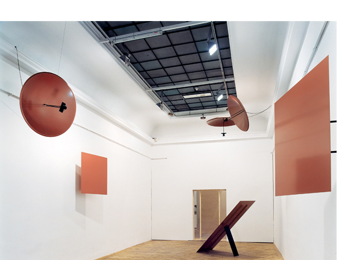 Parabolschalen projizieren gebündelte Klänge auf drei Reflektoren im Raum. Die Klänge sind nur auf den Reflektoren zu hören, nicht in den höher montierten Schalen. Um im akustisch gegliederten Raum die Klang-Bilder zu finden, zu hören und zu erleben, muss die Person der Choreografie der Installation folgen.