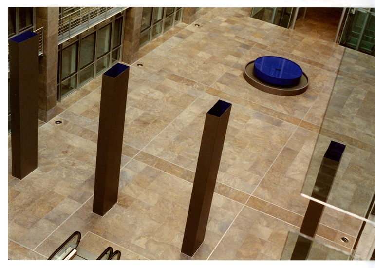 Der Wassertisch ist beides: ein Ton-Objekt, das im Raum seinen Ort akustisch bestimmt und die Klangquelle, die das Ton-Material für die elektronisch-akustische Aktivierung der Klangstelen liefert. Während der natürliche Klang des Wassertisches lokalisiert bleibt, wird Wasser elektronisch verfremdet von den Klangstelen ausgestrahlt zum raumfüllenden Element. Das Atrium füllt sich und wird zu einer lebendigen Hör-Gestalt.