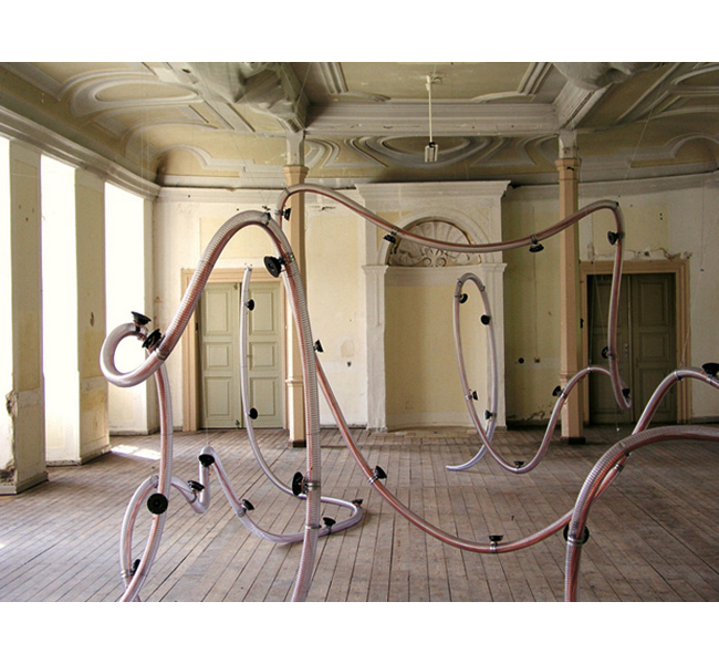 Die organisch frei im Raum aufgehängte Ton-Linien-Skulptur besteht aus 65 mm starken Kunststoffschläuchen. Die Verkabelung ist in den Rohren geführt, um so ein freies Bewegen innerhalb der Skulptur zu gewährleisten.