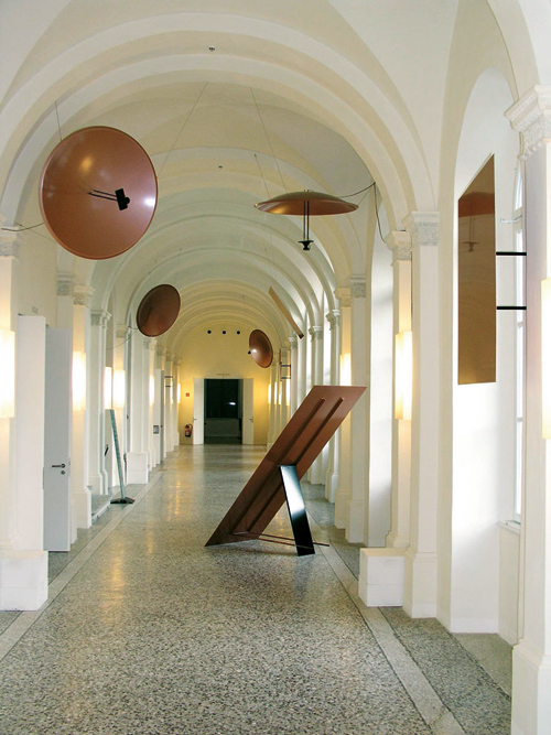Fünf Parabolspiegel (Sender). Fünf Reflektoren (Empfänger). Jeder Klang-Strahl war in dieser Arbeit mit einem eigenen Ton-Material programmiert. Der visuellen Form der Skulptur nach waren in der langen Galerie fünf klar definierte Hör-Räume zu durchwandern. Auf Grund der Enge des Ganges entstanden Doppel- und Mehrfach-Spiegelungen eines Klang-Strahles vom jeweils zugeordneten Metall-Reflektor auf freie Wandflächen oder Fenster. Im Netz von sich kreuzenden, überlagernden Klang-Strahlen materialisierte sich akustisch ein komplexere Raum-Gestalt und Raum-Erfahrung als die visuelle skulpturale Installation.